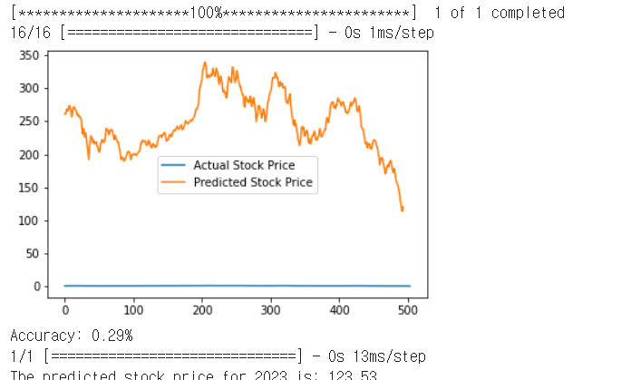 위의 코드를 실행하면, 정확도는 0,29로 약간 떨어지고 나왔습니다. 여러분들이 알고리즘의 값을 변경하면서 좀더 정확한 주가를 예측해 보시기 바랍니다.