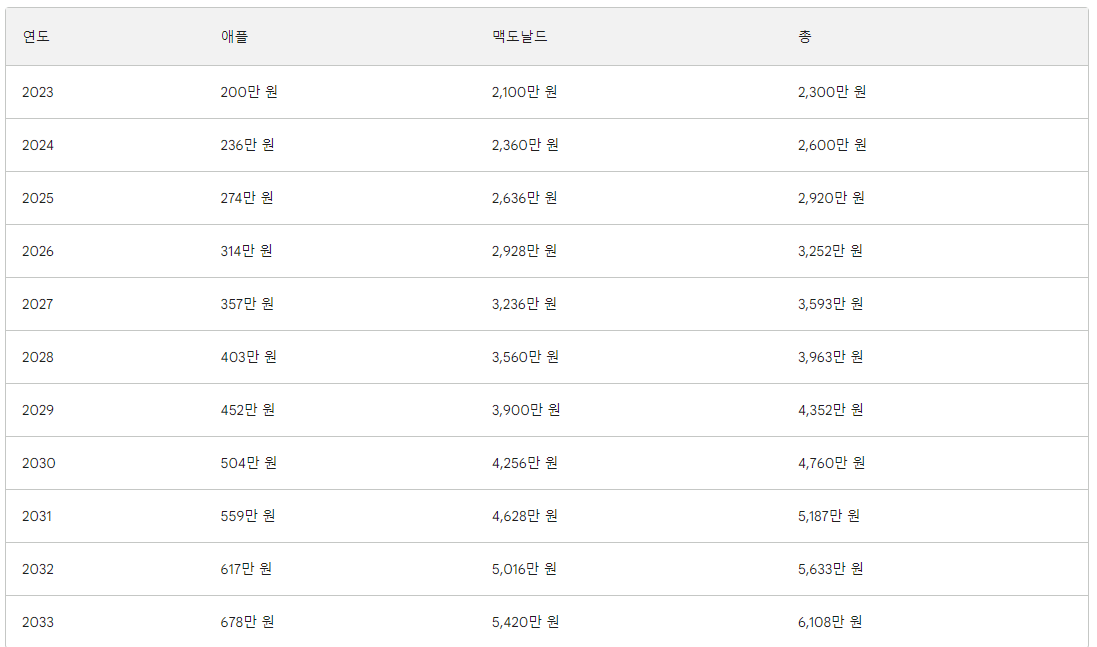 물론, 이 계산은 애플과 맥도날드의 주가가 향후 10년 동안 계속해서 상승하고 배당금이 계속해서 증가한다는 가정하에 이루어졌습니다. 주가가 하락하거나 배당금이 감소한다면 누적 배당금이 더 적을 수도 있습니다.