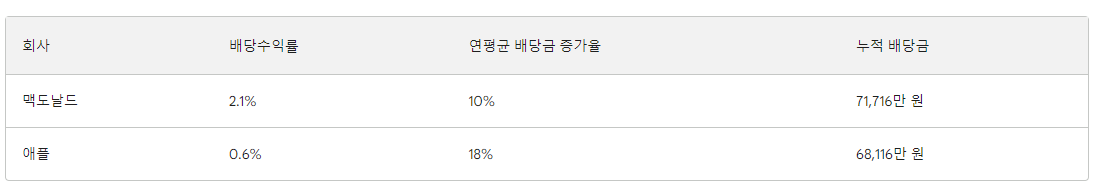 다음은 애플과 맥도날드의 배당금을 비교한 표입니다.