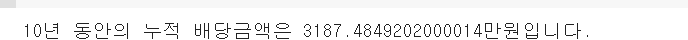 print(f'10년 동안의 누적 배당금액은 {total_dividends}만원입니다.')