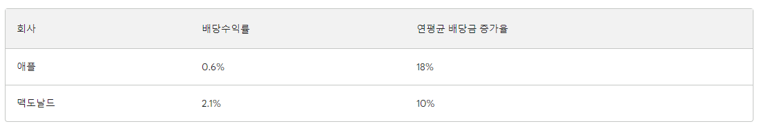 다음은 애플과 맥도날드의 배당금을 비교한 표입니다.