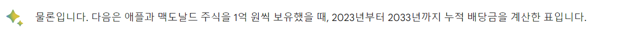 이어서, "위 애플과 맥도날드 주식을 1억씩 보유했을 때, 2023년부터 2033년까지 누적 배당금을 계산해줘" 라고 실행해 보았습니다.