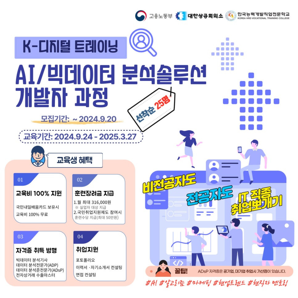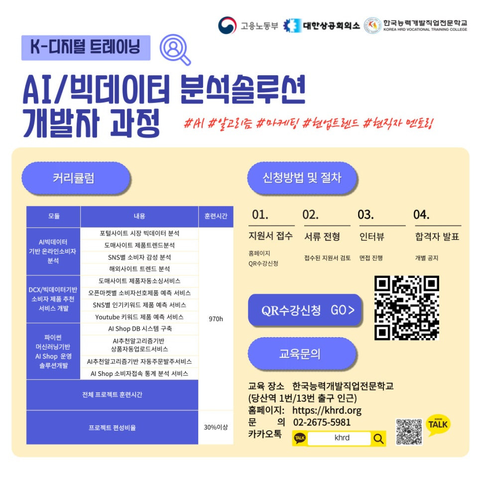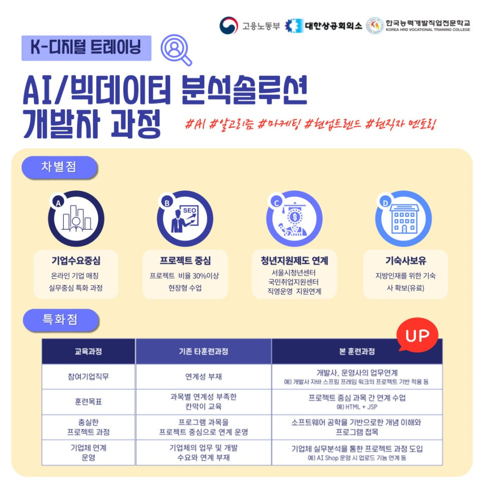 AI/빅데이터 분석솔루션 개발자 과정은 데이터 분석과 인공지능 기술을 심도 있게 학습하고, 실무 프로젝트를 통해 현업에서 필요한 실무 능력을 키울 수 있는 과정입니다. 이 과정은 고용노동부와 대한상공회의소, 한국능력개발직업전문학교가 함께 주관하여 신뢰할 수 있는 교육을 제공합니다.