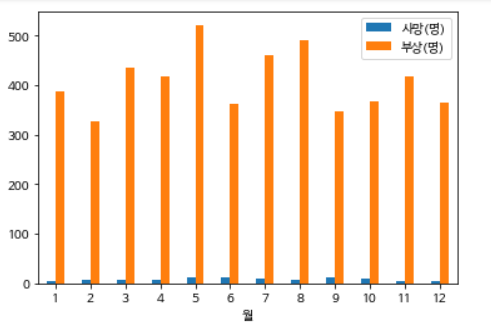 ans2.loc[2016][['사망(명)','부상(명)']].plot(kind='bar',rot=0);