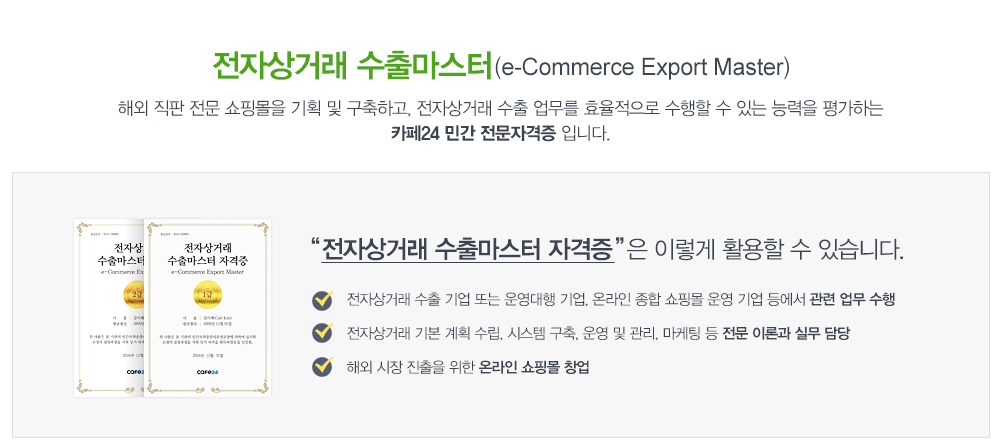 - 일정기간 수강후, 시험을 거쳐 전자상거래 수출마스터 자격증이 발행됩니다.