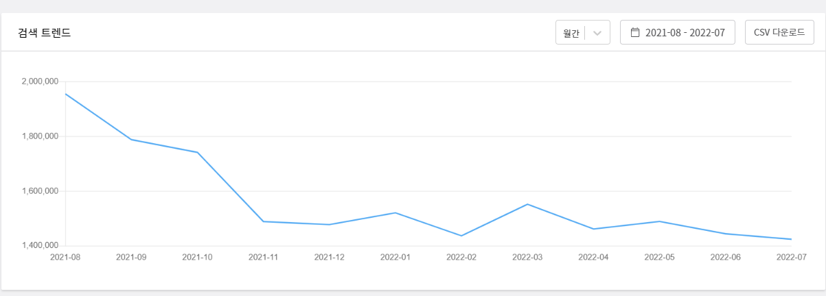 일반 키워드 검색에 블랙위키상에 "부동산"으로 검색하면(22년 8월), 그 검색 추의가 점점하향하는 것을 파악된다. 아무레도 부동산에 대한 관심도와 부동산 가격의 연관성을 보여주고 있는 듯하다.