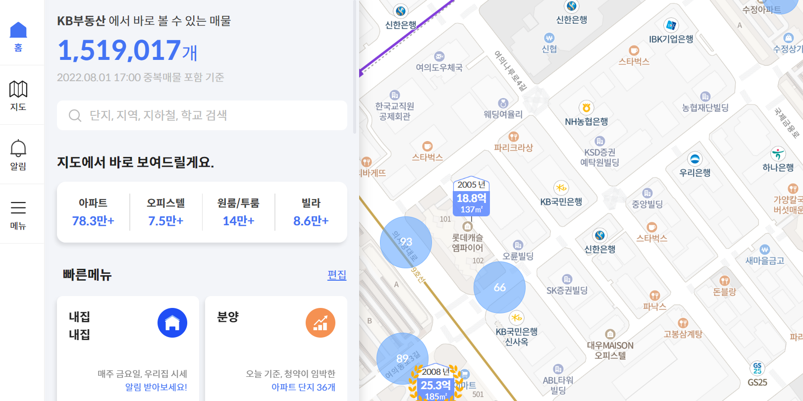 KB 부동산 정보는 아파트 시게, 실거래가, 분양 및 빌라시세와 AI예측시세를 통해 향후 시세 전망을 파악하기에 유용하게 구성되어 있습니다.